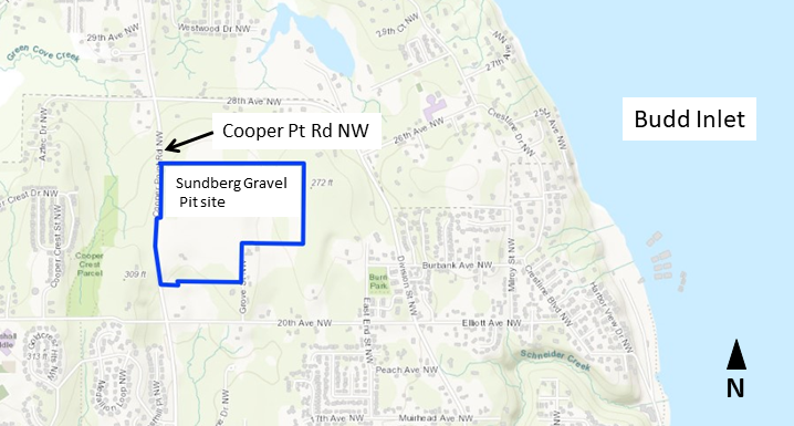 The site is about 51 acres located on the east side of Cooper Point Road between 20th Ave NW and 28th Ave NW. The site was an old gravel mine. Material was brought to the site after mining ended. Some areas were filled with soil, construction and woody debris, and large logs. Petroleum may have entered the soil from leaks or burial. Other toxic material may have been buried or dumped at the site.