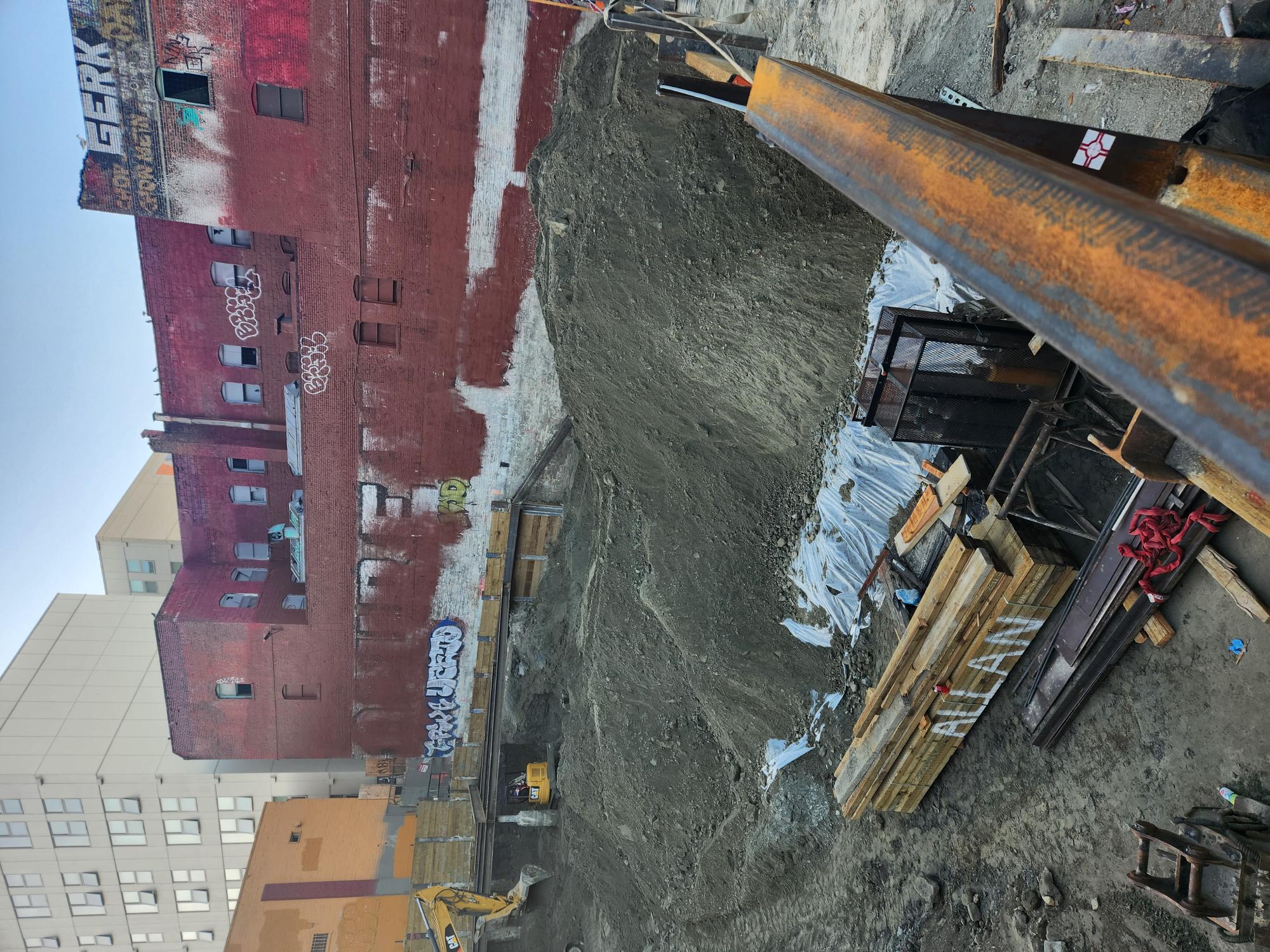 August 2023: Excavation and disposal of soil continues. The western portion of the property is excavated to around 80 ft. Further excavation is needed in the southern portion of the site to remove contaminated soil. All soil exports continue as planned in accordance with the Contaminated Material Management Plan. As the excavation continues, walls are installed on the edges of the pit to make sure soil does not fall back into the excavation. This is called shoring and lagging and is currently being installed and inspected throughout this month.
