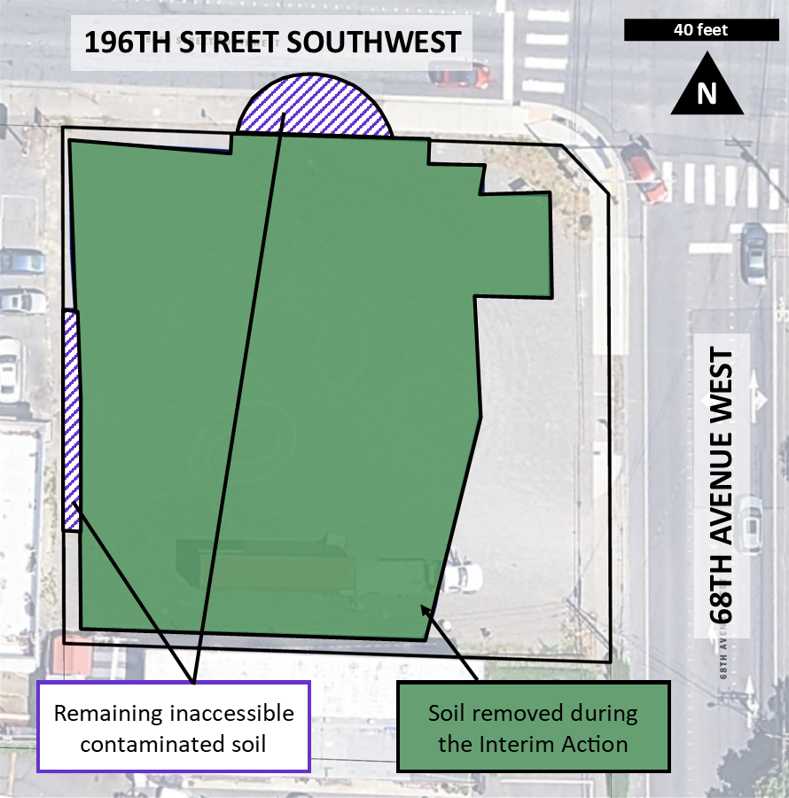In 2022, an interim cleanup action was done at the Site which removed most of the soil contamination. An interim action is a partial cleanup done before the final cleanup. A few areas of inaccessible soil with contamination above state cleanup levels remain in the following locations: