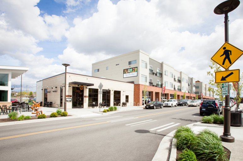 Today, Kendall Yards is a thriving, multi-use walkable community with easy connectivity to downtown Spokane and Spokane Transit bus routes. Street-level commercial businesses are intermixed with public spaces, public art, Centennial Trail connection, and single- and multi-family housing. A locally owned grocery store was also constructed to serve the community.