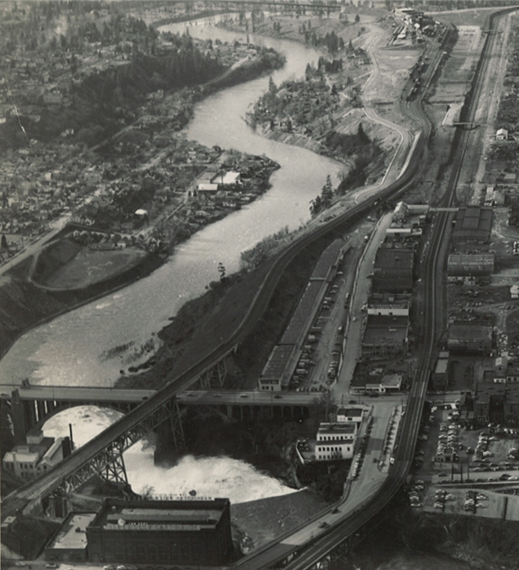 From 1914 to 1955, the 77-acre property just north of downtown Spokane and south of the historic West Central neighborhood was used by Union Pacific Railroad as a rail line operational facility. Great Northern Railroad also brought its main line along the northern edge of the property. The West Spokane Yard had miles of tracks, a roundhouse, a steam locomotive repair and passenger car servicing complex, and fuel storage and refueling facilities. The main complex was located on the western portion of the site and included a railroad turntable, above-ground oil storage tanks, and oil distribution pipelines. Coal- and oil-fired steam engines were serviced here.