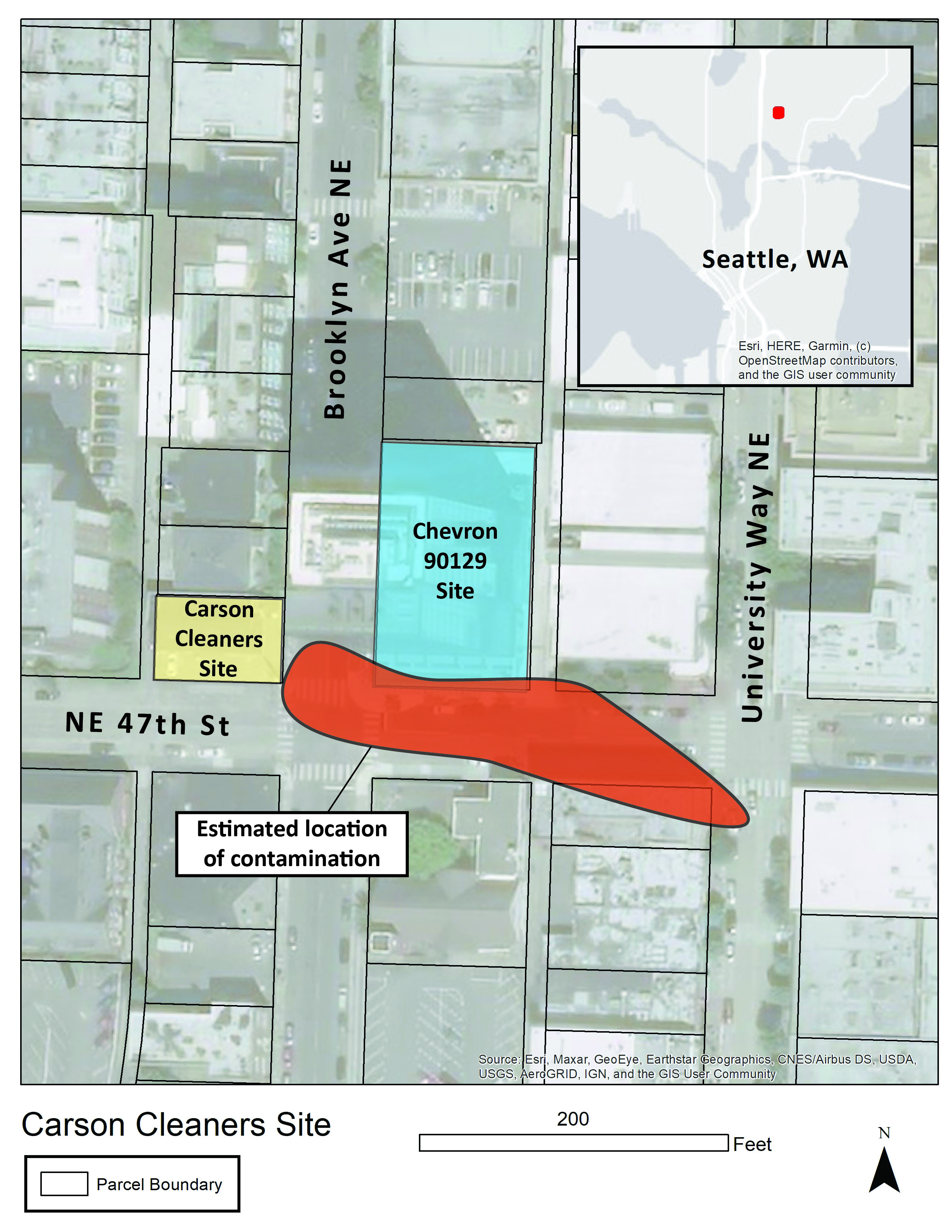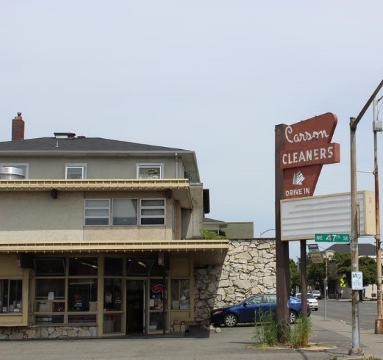 The former Carson Cleaners operated a dry-cleaning business as a tenant on the property from the early 1960s until 2014. During the 2018-2019 environmental cleanup of the Chevron 90129 Site across the street, chemicals commonly used in dry cleaning operations were discovered in the southwestern portion of the Chevron property and along the edge of NE 47th Street. These chemicals were in the form of halogenated volatile organic compounds (HVOC). After studying the groundwater flow direction, it was determined that these chemicals may have come from Carson Cleaners.