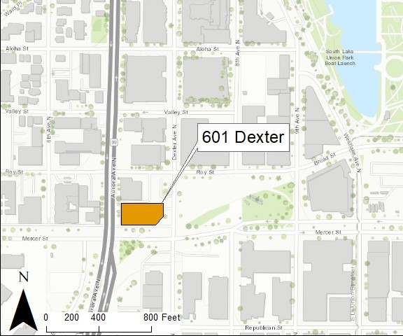 The site is generally located at 601 Dexter Ave N in Seattle’s South Lake Union neighborhood. It includes one King County parcel that is approximately 0.54 acres (Property). Currently, there is a commercial building occupied by Copiers Northwest and a parking lot in the northeastern part of the Property. An alley right-of-way owned by the City of Seattle separates the Property from the adjacent property (615 Dexter Ave N).