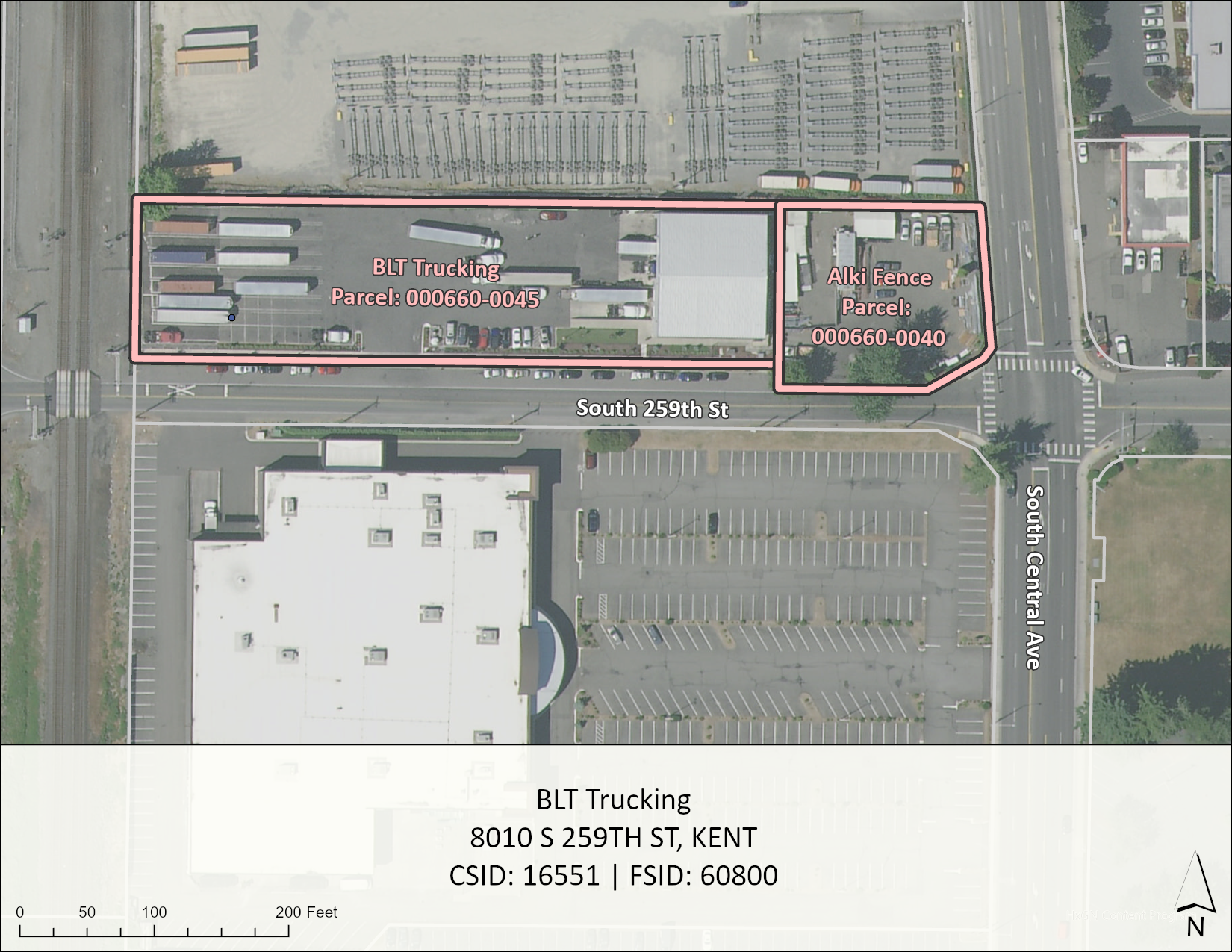 The BLT Trucking property was historically a part of a larger 2-acre parcel that included the BLT Trucking parcel (parcel number 000660-0045, approximately 1.3 acres) and the adjacent parcel to the east, Alki Fence (parcel number 000660-0040, approximately 0.45-acre). The original 2-acre property was operated by Atomic Auto Wrecking from approximately 1980 to the early 1990s.