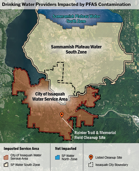 PFAS has also been detected in some water supply wells operated by Sammamish Plateau Water and Sewer District (SP Water). Wells with the highest PFAS levels were removed from service in 2017 and SP Water continues to meet safe drinking water levels. SP Water is working to design and build a water treatment facility to remove PFAS from its impacted wells.