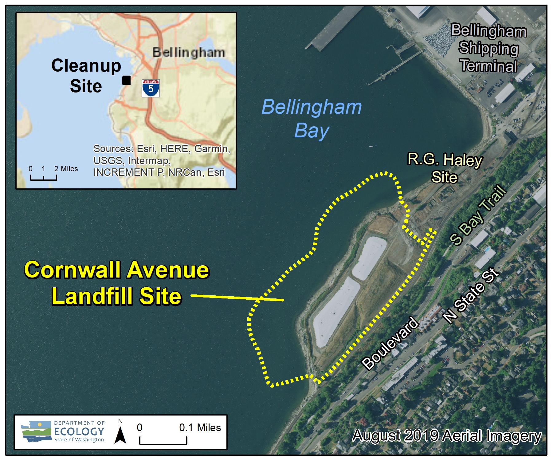 The Cornwall Avenue Landfill cleanup site is located on the Bellingham waterfront between Boulevard Park and the former Georgia Pacific pulp mill at the south end of Cornwall Avenue. About 13 acres of the site are on land, and about 3.5 acres are in water. Property within the site is owned by the City of Bellingham, the Port of Bellingham, and the State Department of Natural Resources. It is most recognizable today for the large mounds covered with white plastic.