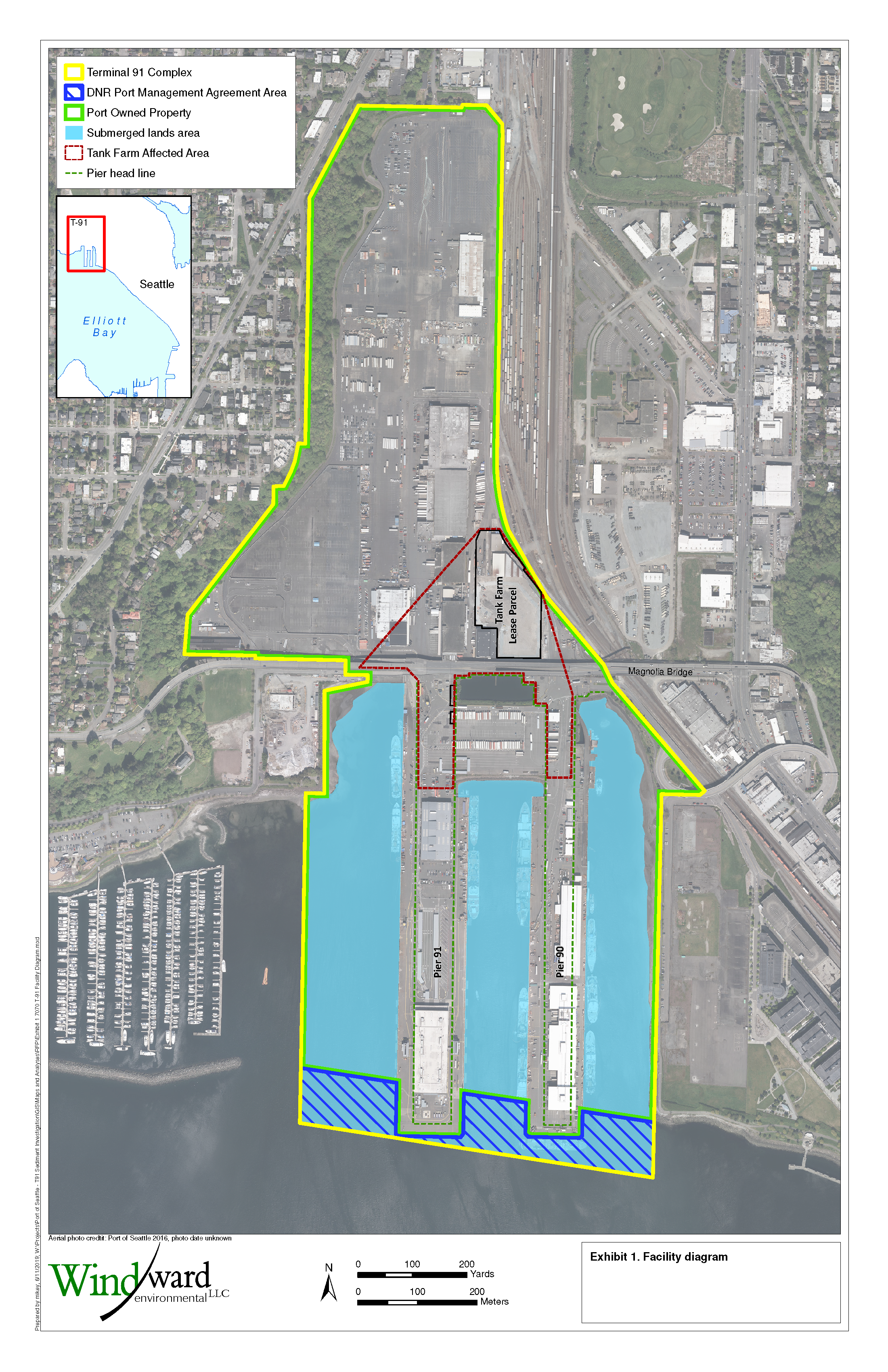 The T91 Complex was operated by several oil companies from 1926 until 1941, when the U.S. Navy took possession. The Port purchased the facility in the 1970s. A four-acre parcel of the T91 Complex is the site of a former tank farm. Constructed in the 1920s, it operated as a fuel storage facility until it was demolished in 2005. In 1992, the owner of the tank farm, Burlington Environmental Inc. (BEI), was issued a permit to operate as a dangerous waste treatment and storage facility (TSD). Although the permit is no longer active, the Port is responsible for cleanup of contamination at the site.