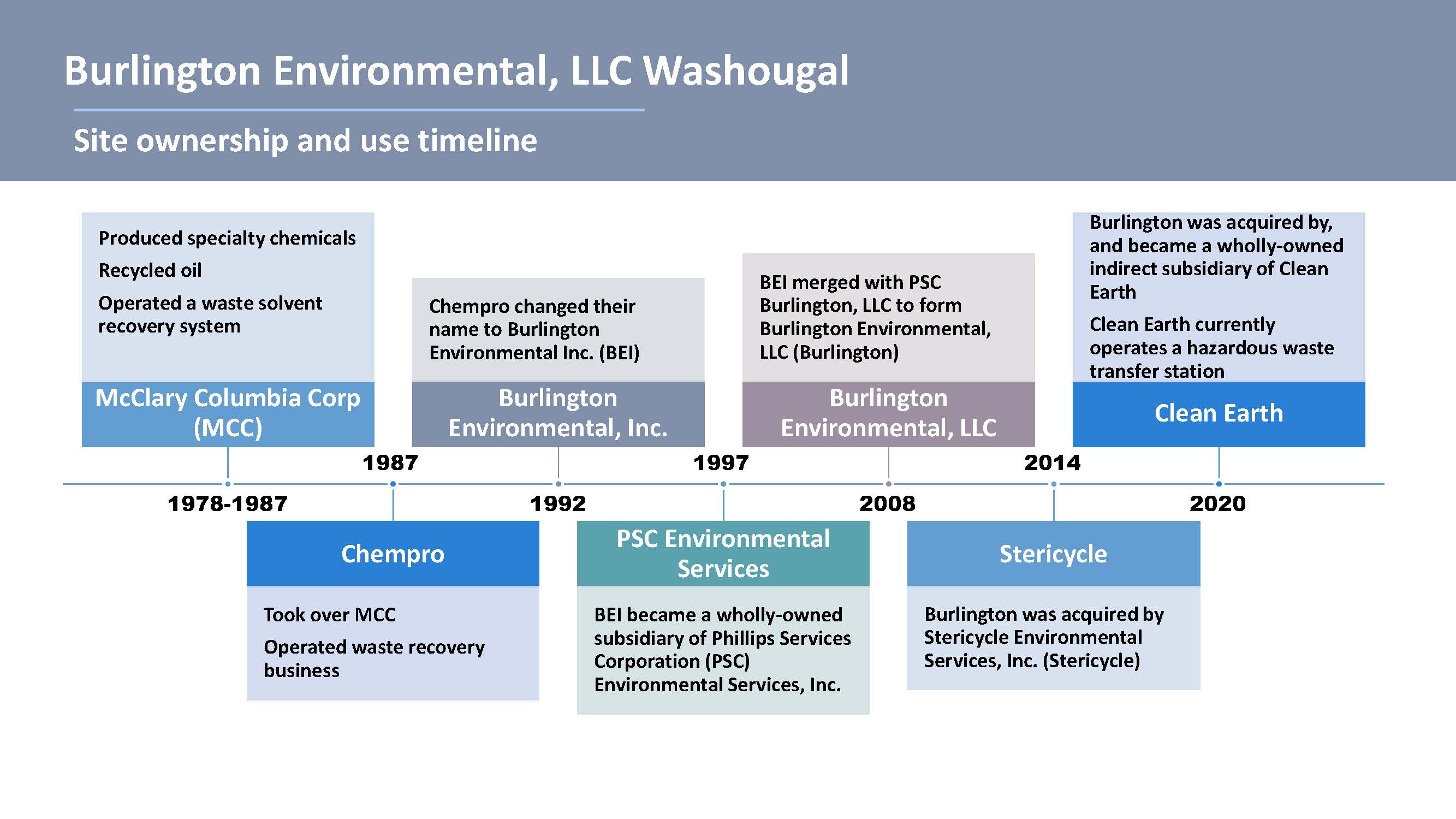 The Washington Department of Ecology (Ecology) held a public comment period between September 27, 2021 and November 26, 2021 for the following draft cleanup documents for the Burlington Environmental, LLC Washougal facility: