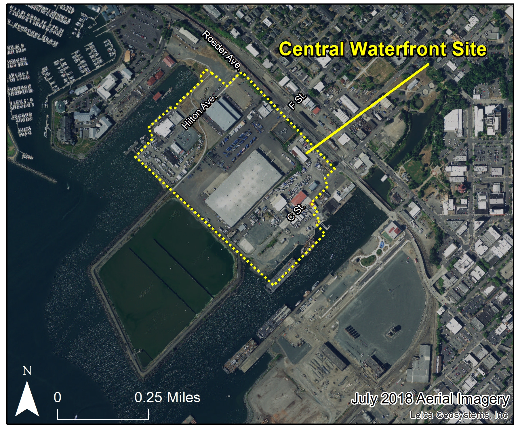 The Central Waterfront cleanup site is made up of about 51 acres on Bellingham’s downtown waterfront, between I & J Waterway and Whatcom Waterway, and between Roeder Avenue and the former Georgia-Pacific industrial wastewater treatment lagoon. Property within the site is owned primarily by the Port of Bellingham or City of Bellingham. Beginning in the early 1900s, the site and surrounding tidelands were filled for various industrial uses.