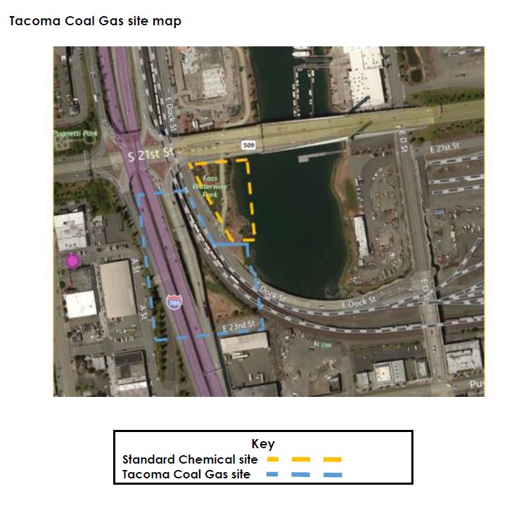 The Tacoma Coal Gas plant, located at the head of the Thea Foss Waterway, operated between 1884 and 1924. After it closed, property owners removed above-ground structures and covered the site with fill. Contamination was discovered on the site in 1984 during geotechnical drilling for construction of I-705.