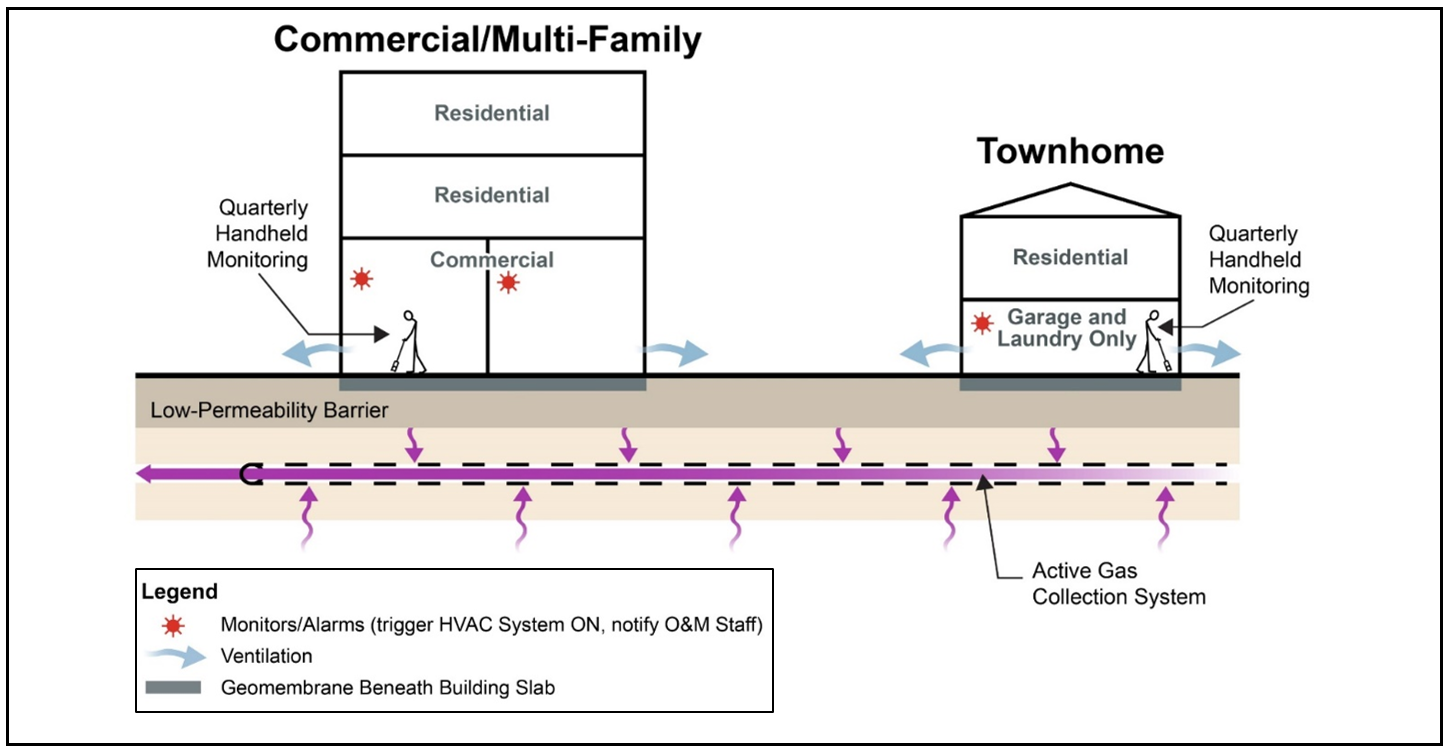 This amendment maintains the existing requirements of the CD. Additionally, it clarifies that street-level residential use, such as the proposed Work/Live Units, utilize a separation space between residential space and the ground, with monitoring and ventilation and additional landfill gas sensors and alarms.