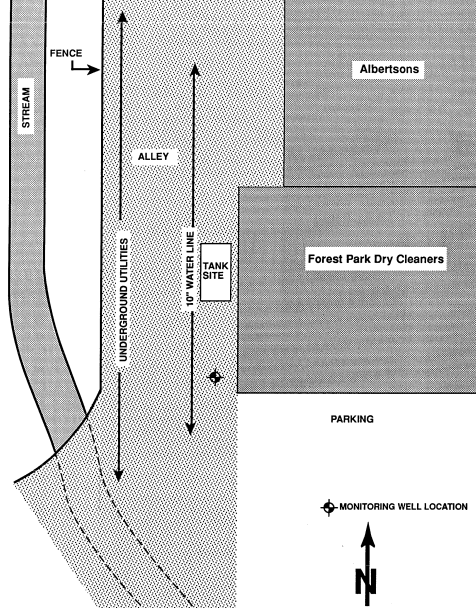 Forest Park Cleaners was in business from 1989 to 1997. It was located in the southwest portion of the strip mall. Before Forest Park cleaners opened, an underground storage tank used to store heating oil was removed from the alley to the west of the building. Releases of contamination to groundwater were discovered in 1997.