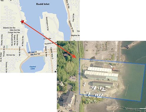 The Reliable Steel site is on the west side of Budd Inlet. It extends east of West Bay Drive into the water, including part of the inlet. The site was originally developed as a lumber mill. From 1941–2009, it was used for boat building, steel fabrication, or welding.