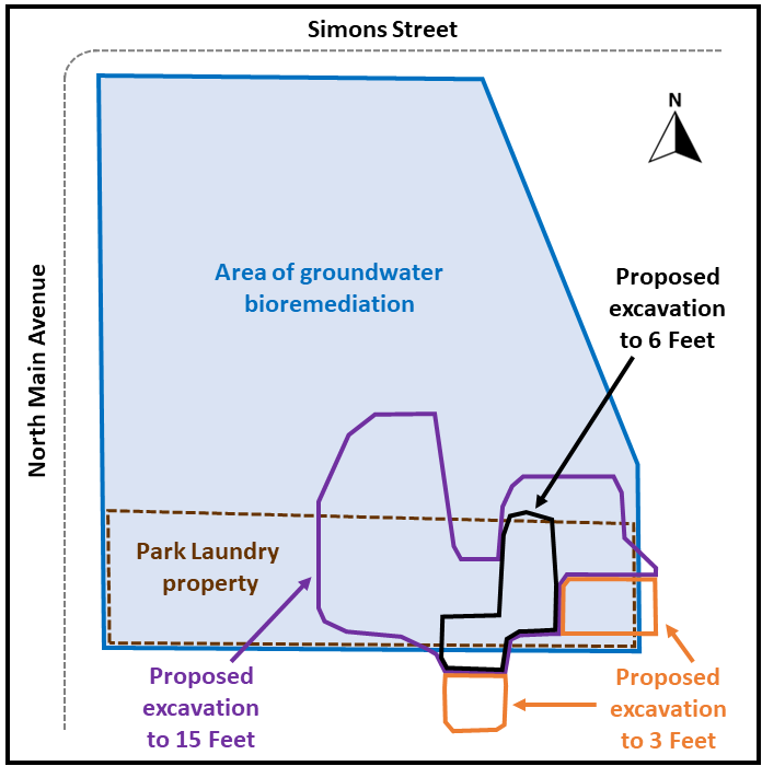 Soil excavation and removal: The city will excavate about 1,000 square yards of contaminated soil to several depths below the surface. The engineering-design phase of the cleanup will determine the excavation area and depth more precisely. The excavated contaminated soil will be removed from the site and disposed of appropriately. Water collected from the excavations will be treated and properly disposed of. Removal of contaminated soil and water will reduce the source of groundwater contamination. Excavations will be filled with clean soil and the site returned to the original grade. Gravel or asphalt pavement will be used to cover the soil surface.