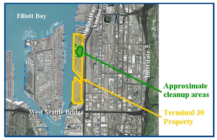 The Port of Seattle’s Terminal 30 property is 33.9 acres and is located at 1901 East Marginal Way South in Seattle, Washington. The cleanup Site (where cleanup is occurring) is approximately 11 acres (one large area and one small area) in the northern portion of the property. Terminal 30 is located along the East Waterway across from Harbor Island. The East Waterway is part of the Harbor Island Superfund Site and is regulated by the U.S. Environmental Protection Agency (EPA).